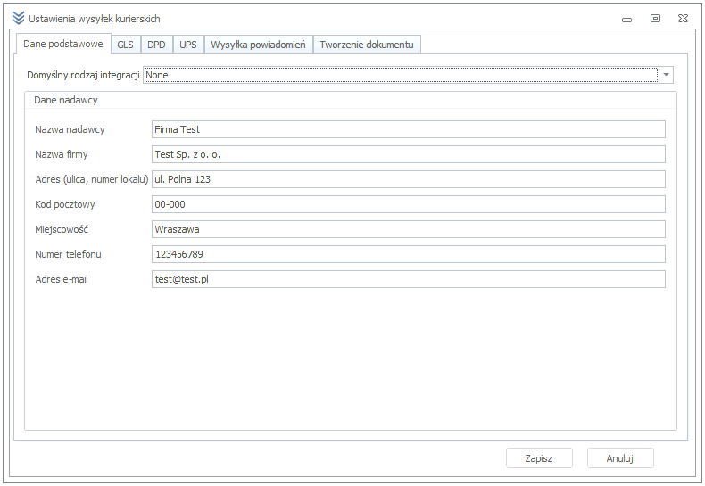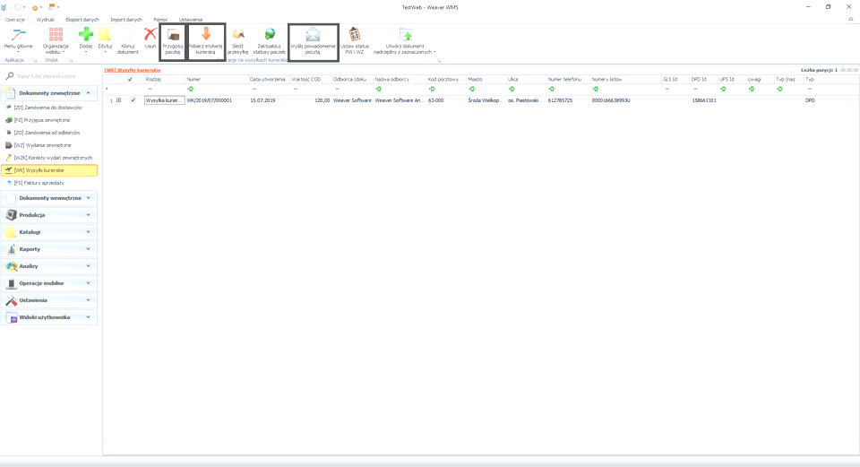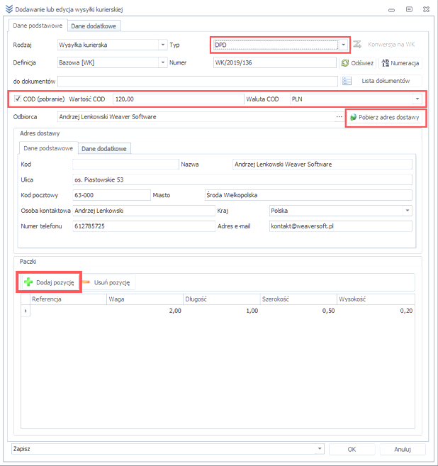 After configuring, we can start adding shipments. To add a shipment, go to External documents -> Courier shipments -> Add icon. In the new window, we define all shipping parameters, including: